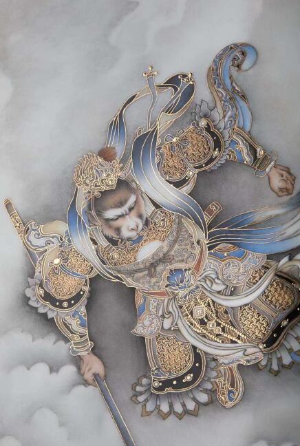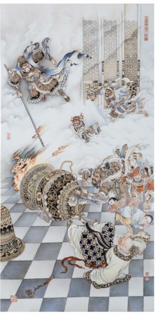 顧堅瓷板畫代表作再現(xiàn)了齊天大圣大鬧天宮的經典畫面(展覽方 供圖)