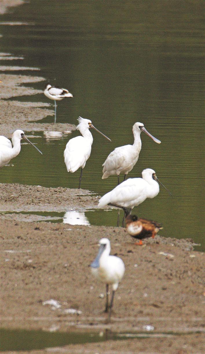 2號(hào)魚塘里的黑臉琵鷺群。