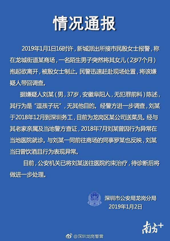 1月2日,深圳市公安局龍崗分局發(fā)布情況通報(bào)稱:已將劉某送往醫(yī)院約束治療,待診斷后將做進(jìn)一步處理。