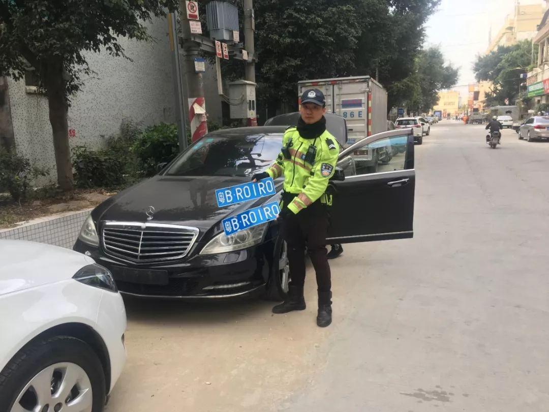 2018年12月28日下午17時左右,深圳交警鐵騎隊員巡邏至寶安沙井洋下大道附近的修理廠時,發(fā)現(xiàn)一輛黑色奔馳未懸掛號牌。