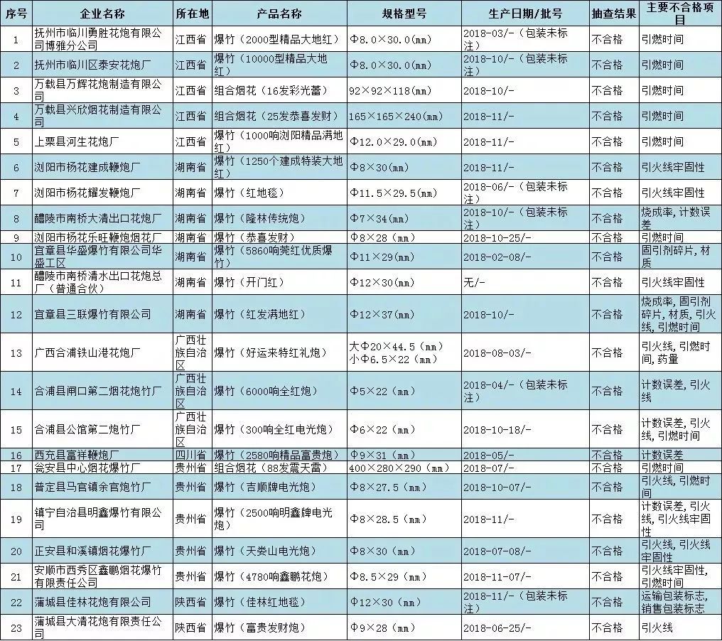 ③國(guó)家市場(chǎng)監(jiān)管總局日前組織開展煙花爆竹產(chǎn)品質(zhì)量國(guó)家監(jiān)督專項(xiàng)抽查,共抽查6個(gè)省(自治區(qū))150家企業(yè)生產(chǎn)的150批次產(chǎn)品,檢出23批次不合格,不合格發(fā)現(xiàn)率為15.3%。