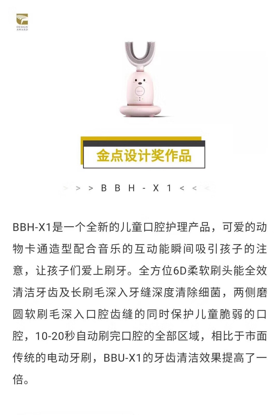 這款融入了“人工智能”、“大數(shù)據(jù)分析”、“3D打印”、“觸摸控制”、“無線充電”、“高效磁懸浮浮生波電機”、“區(qū)塊鏈”于一體的智能6D口含式刷牙器,卻與現(xiàn)在市面上推出的大多兒童電動牙刷不同。這款智能電動刷牙器,擁有自主專利口含式U型外觀,6D刷毛能完全貼合牙齒表面,僅需20秒即可全方位清潔牙齒表面,可以讓孩子輕松地掌握刷牙方法。而且充滿童趣的可愛外表,讓孩子愛上刷牙。并且它的人工智能系統(tǒng)還可監(jiān)測孩子的口腔健康狀況,就像多了一位24小時私人口腔護理專家,能更好地預警蛀牙風險。