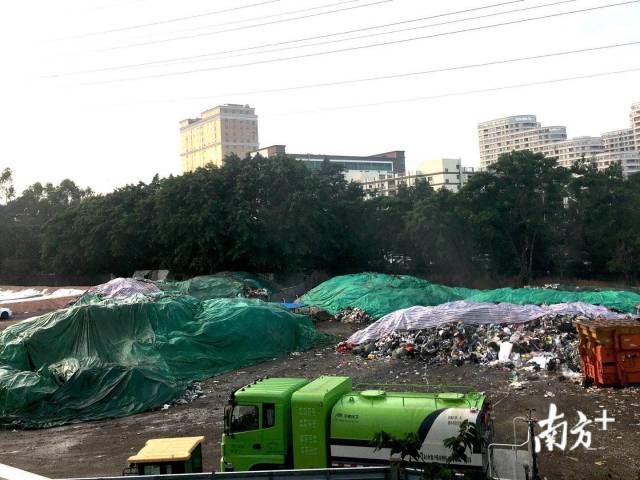 一位正在用帆布遮蓋垃圾的工作人員表示,這里堆放的垃圾全部來自大浪街道轄區(qū)內(nèi)的生活垃圾。據(jù)他了解,他們公司每天會運(yùn)送9車?yán)?一車可運(yùn)來十多噸。