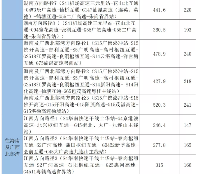從廣州出發(fā),通往湖南、廣西東北部、江西、福建、廣西北部灣及海南方向的出行指引: