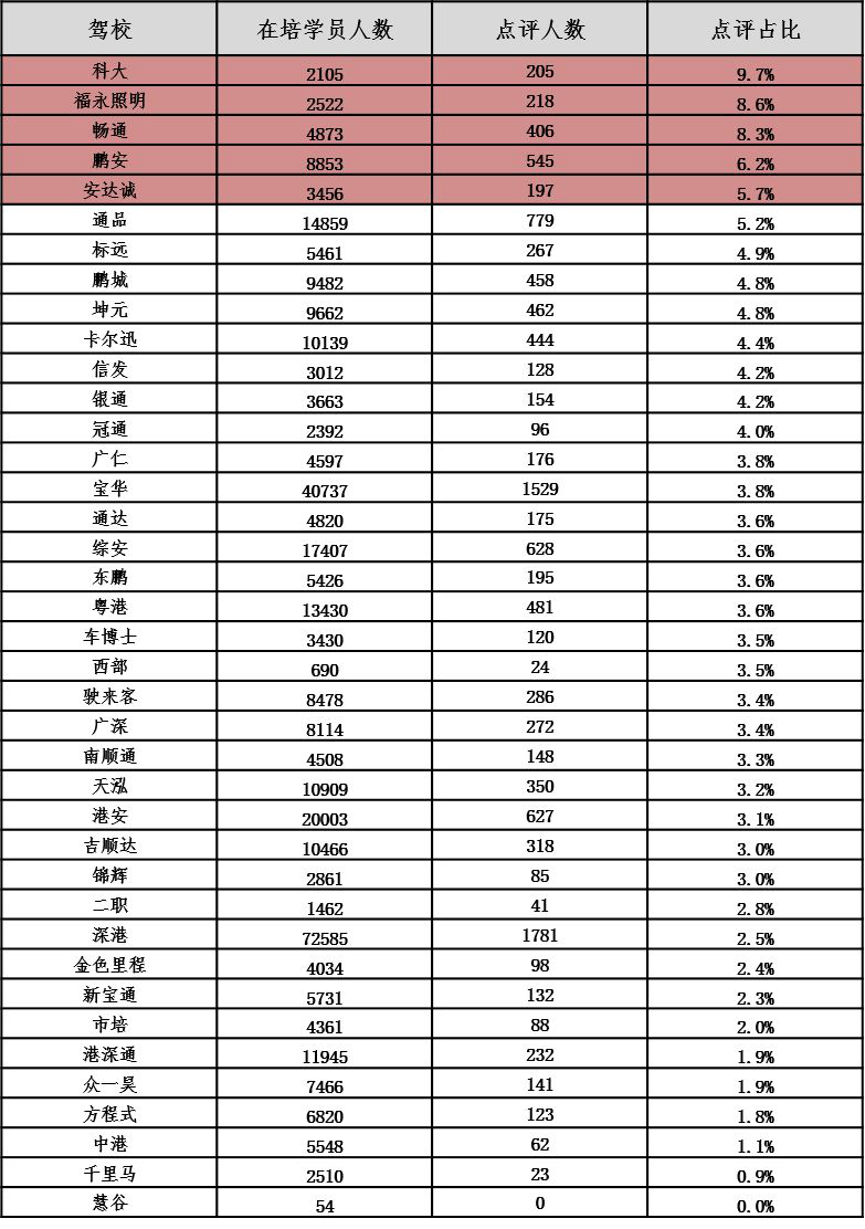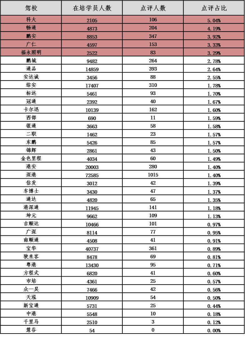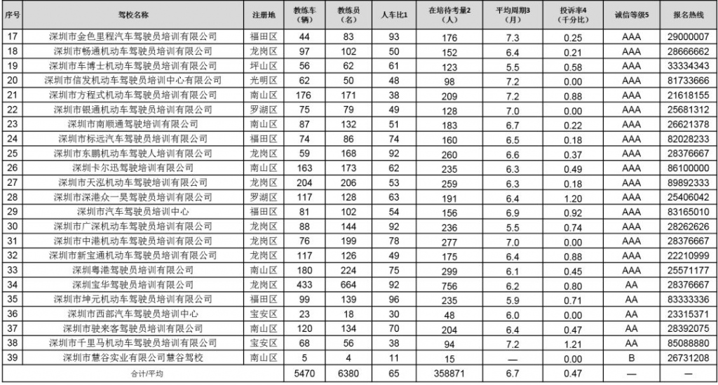 以下對深圳各駕校詳細(xì)信息進(jìn)行公布,市民可根據(jù)下表,選擇人車比和在培待考量相對較低、學(xué)車周期較短、投訴率較低、誠信評價等級較高的駕校進(jìn)行培訓(xùn):