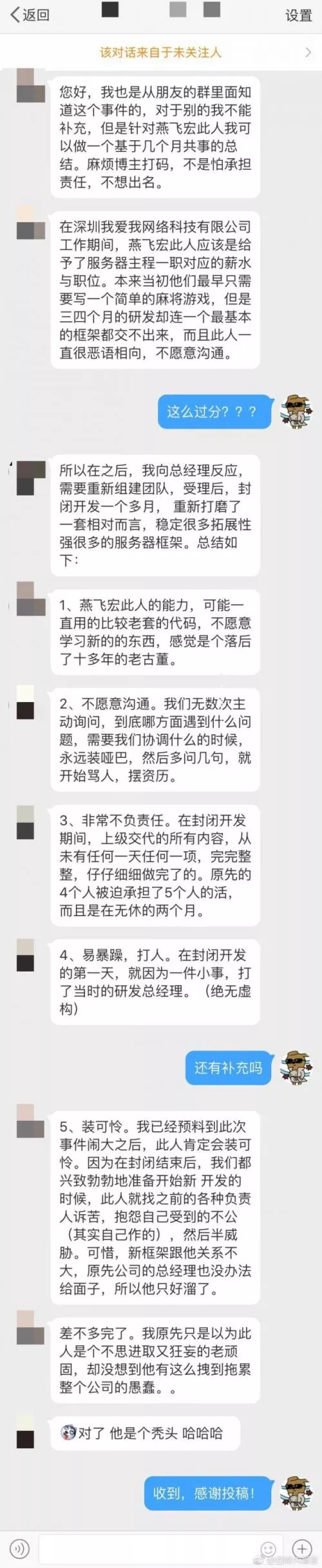 隨后,一位自稱是燕飛宏前同事的網(wǎng)友發(fā)文稱:之前的公司讓他做很簡單的游戲,但是他三四個月連框架都沒寫出來,業(yè)務(wù)能力只會用老套代碼,不愿意跟同事溝通,工作很不負(fù)責(zé)任、易暴躁、打人。