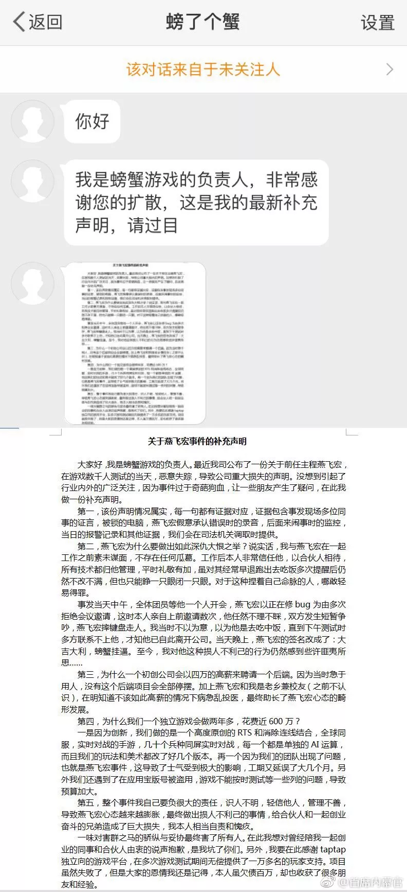 該微博一同曝光的還有一份“關(guān)于燕飛宏的補充聲明”,自稱是螃蟹游戲負(fù)責(zé)人的“螃了個蟹”表示,自己與燕飛宏在一起工作之前素未謀面,不存在任何瓜葛,工作后非常信任他,以合伙人相待,所有技術(shù)都?xì)w他管理,因為捏著公司命脈,對其經(jīng)常早退也只能睜一只眼閉一只眼。