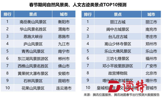 除了返鄉(xiāng)外,春節(jié)同樣是外出旅游的好時(shí)機(jī)。據(jù)《報(bào)告》預(yù)測(cè),在全國259家5A級(jí)旅游景點(diǎn)中,南岳衡山風(fēng)景區(qū)、華山風(fēng)景名勝區(qū)、恩施大峽谷將排名最火爆自然風(fēng)景類景區(qū)前三,麗江古城、閬中古城景區(qū)、臺(tái)兒莊古城則是最具人氣的人文古跡類景區(qū)前三。