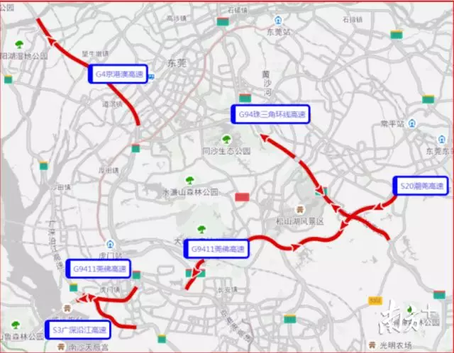 建議途經(jīng)廣深高速公路由深圳往廣州方向(北行)的車輛,在北行長安出口、虎門出口繞行國道或轉(zhuǎn)到?;⒏咚俟返綇V州。