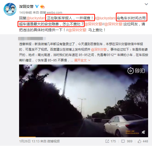 1月28日下午5點(diǎn),深圳交警在微博上也給網(wǎng)友作出回復(fù),對(duì)于長(zhǎng)時(shí)間龜速占用超車道的行為也將一并調(diào)查。