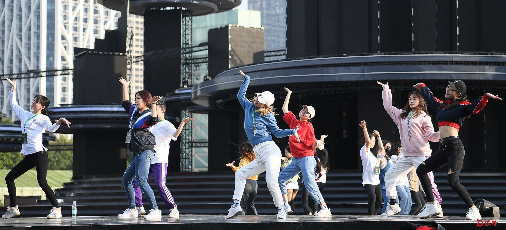 “你們的目光所及都是舞臺!”當記者當天下午來到市民中心廣場時彩排,分會場總導(dǎo)演孫濱指著搭建的主舞臺、舞臺前方的階梯和廣場、以及舞臺后方的高樓大廈這樣說。