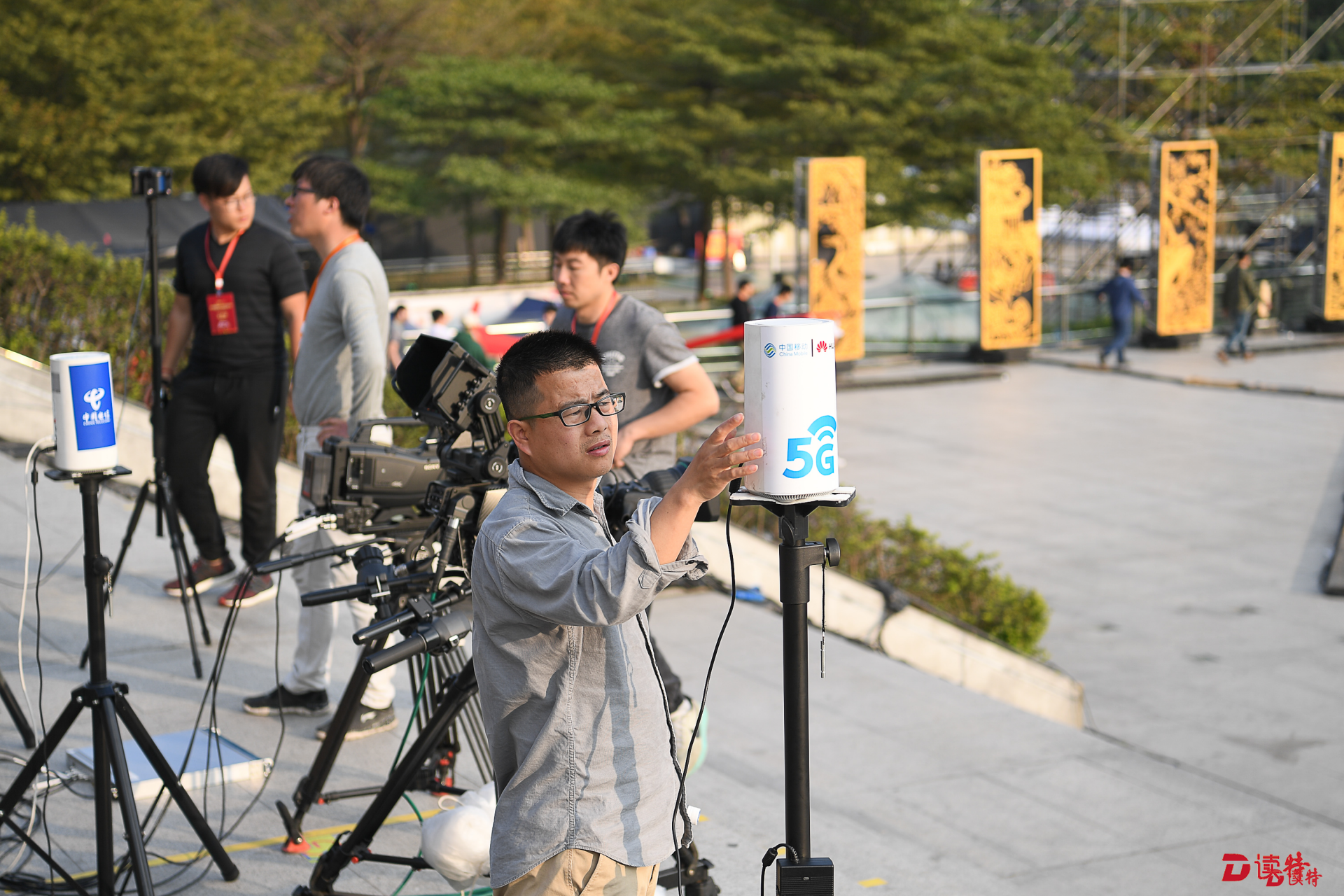 在市民中心廣場,央視的5G網(wǎng)絡(luò)VR實時制作團隊連日來已經(jīng)在反復(fù)調(diào)試設(shè)備。記者看到,他們的設(shè)備相當簡單便捷,包括有6個鏡頭的全景攝像頭和5G網(wǎng)絡(luò)接入終端,工作人員手持兩臺筆記本電腦用于現(xiàn)場VR視頻的縫合,從而實現(xiàn)VR超高清視頻通過5G網(wǎng)絡(luò)的制作和回傳。