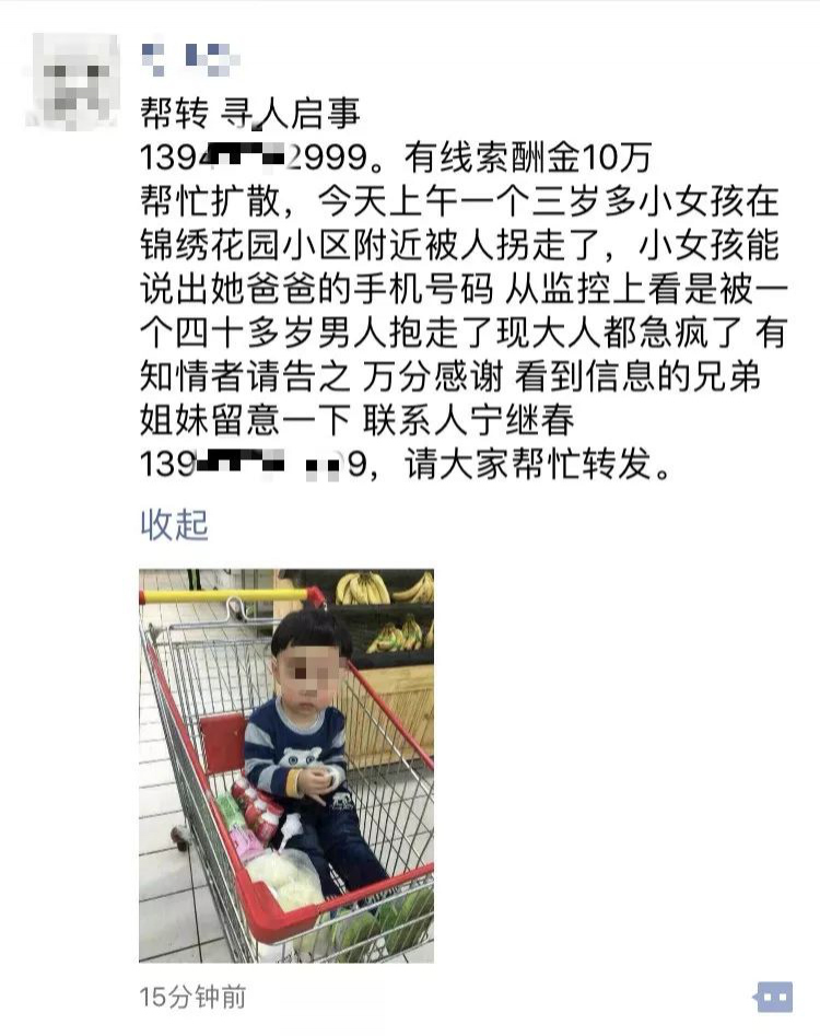 深圳晚報(bào)2019年2月13日訊 2月10日晚間一則內(nèi)容為"家長懸賞10萬元尋找3歲被拐女孩"的消息,刷爆了很多網(wǎng)友的微信朋友圈。"幫忙擴(kuò)散,3歲女孩在錦繡花園小區(qū)被拐走,家長拿出10萬元酬金尋人……"網(wǎng)友紛紛傳遞愛心的同時(shí),也在為女孩的安危捏著一把汗。然而,記者調(diào)查發(fā)現(xiàn)實(shí)際情況卻并非如此......