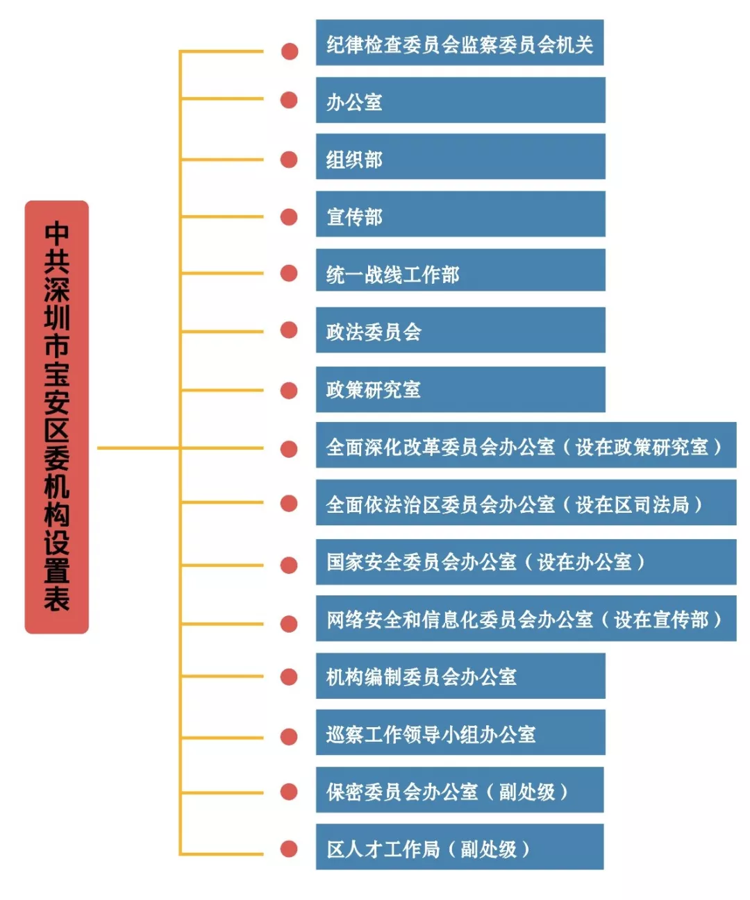 說(shuō)明:深圳市寶安區(qū)委設(shè)置紀(jì)檢監(jiān)察機(jī)關(guān)1個(gè),計(jì)入機(jī)構(gòu)限額的工作機(jī)關(guān)10個(gè)(設(shè)在相關(guān)部門的區(qū)委議事協(xié)調(diào)機(jī)構(gòu)的辦事機(jī)構(gòu)不計(jì)入機(jī)構(gòu)限額)。其中,紀(jì)律檢查委員會(huì)與監(jiān)察委員會(huì)合署辦公,實(shí)行一套工作機(jī)構(gòu)、兩個(gè)機(jī)關(guān)名稱;辦公室掛區(qū)外事局、區(qū)檔案局牌子;組織部掛區(qū)直屬機(jī)關(guān)工作委員會(huì)、區(qū)非公有制經(jīng)濟(jì)組織和社會(huì)組織工作委員會(huì)、區(qū)公務(wù)員局牌子;宣傳部掛區(qū)精神文明建設(shè)委員會(huì)辦公室、區(qū)新聞出版局、區(qū)互聯(lián)網(wǎng)信息辦公室牌子;統(tǒng)一戰(zhàn)線工作部掛區(qū)民族宗教事務(wù)局、區(qū)臺(tái)港澳事務(wù)局、區(qū)僑務(wù)局牌子;保密委員會(huì)辦公室掛機(jī)要局、區(qū)國(guó)家保密局、區(qū)密碼管理局牌子。