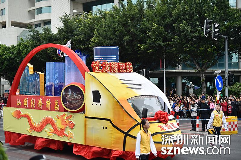帶有汕頭經(jīng)濟(jì)特區(qū)字樣的花車正在行進(jìn)