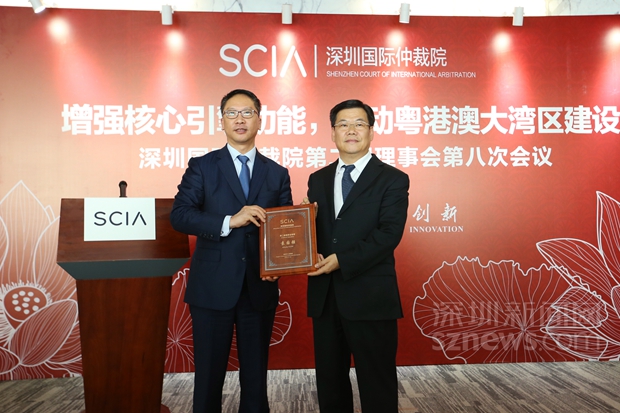 2月21日的發(fā)布會上,深圳市副市長黃敏為新聘任的兩名深圳國際仲裁院理事袁國強(香港前律政司司長)、劉春華(中聯(lián)辦法律部部長)頒發(fā)了聘書。