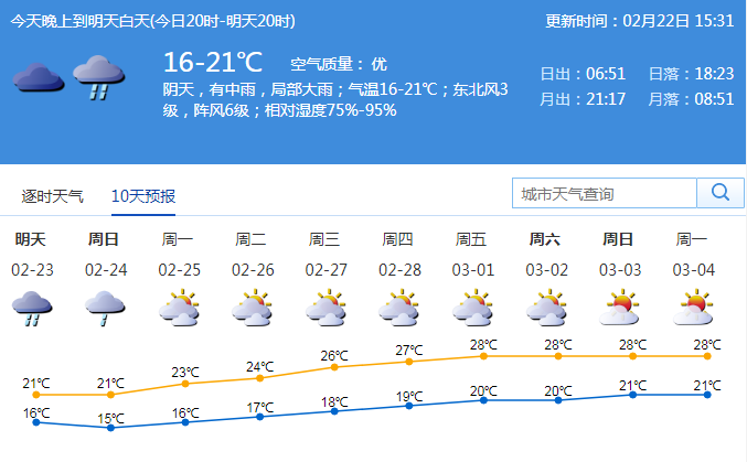 市氣象局預(yù)計(jì),23-24日,深圳市有中雨局部大雨,可能伴有雷暴,降雨時(shí)段主要出現(xiàn)在23日白天到24日上午,沿海和高地有7級(jí)偏東陣風(fēng);23日氣溫在16-21℃;東北風(fēng)3級(jí);相對濕度75%-95%;25日起多云可見陽光,天氣溫暖。