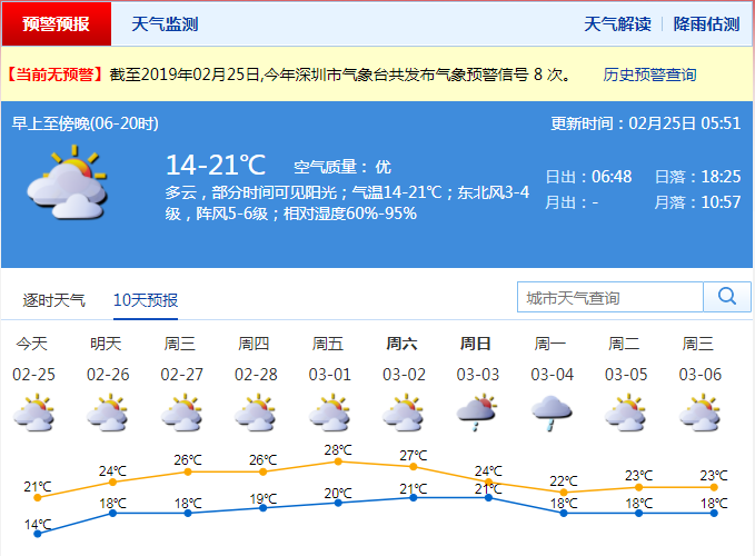 深圳新聞網(wǎng)2019年2月25日訊 記者從深圳市氣象局了解到,24日降雨結(jié)束,天色趨于明朗,白天最高氣溫18℃左右。預(yù)計(jì)25日起多云可見陽光,氣溫逐日回升,有輕霧或霾,轉(zhuǎn)溫暖濕潤天氣。展望3月我市天氣偏暖,空氣潮濕,雨霧等低能見度天氣易發(fā)。3月仍有3-4次弱冷空氣影響,強(qiáng)度比本次冷空氣弱,但冷空氣活動時(shí)氣溫都會比前日略降,并轉(zhuǎn)陰雨天氣。