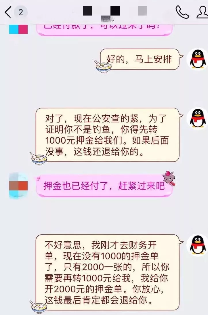 轉(zhuǎn)賬后,小李同學(xué)到一酒店開好房間,靜等“小妹”上門,但此時(shí),對方要求再交1000元“風(fēng)險(xiǎn)押金”才能安排“小妹”過來。