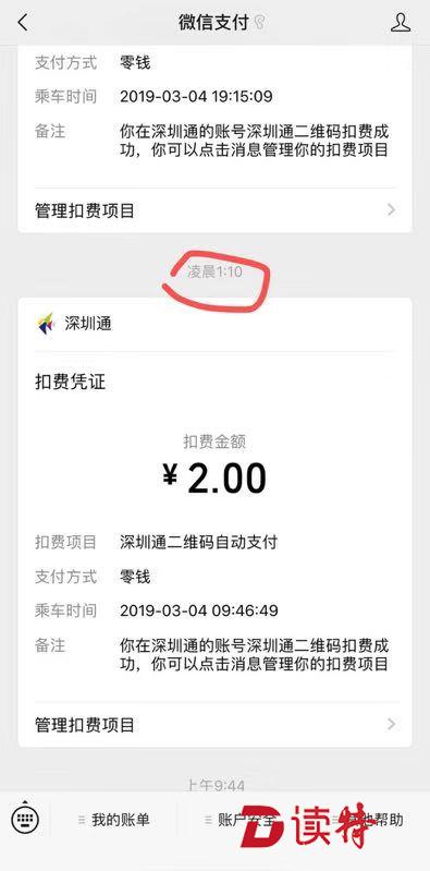 5日中午,記者再次使用“深圳通+”小程序支付車(chē)費(fèi),掃碼后隨即收到一條“1.6元”的付款信息,過(guò)了不到5分鐘又收到了一條“1.6元”的扣費(fèi)信息,但乘車(chē)時(shí)間顯示為“3月4日”。這是否是重復(fù)扣費(fèi)呢?