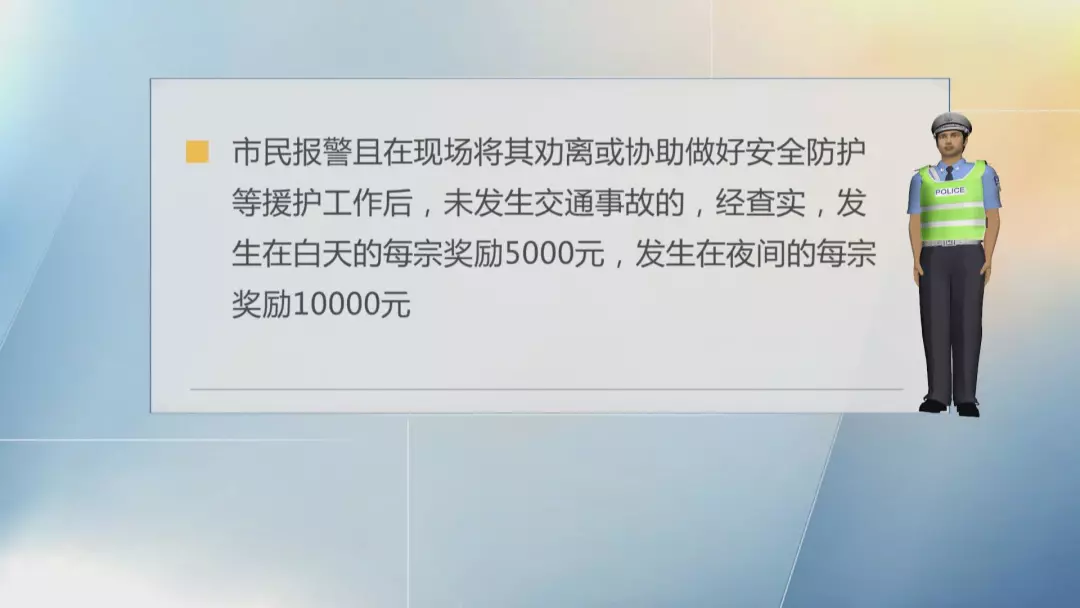 第三種則是市民報(bào)警且在現(xiàn)場(chǎng)將其勸離或協(xié)助做好安全防護(hù)等援護(hù)工作后,未發(fā)生交通事故的,經(jīng)查實(shí),發(fā)生在白天的每宗獎(jiǎng)勵(lì)5000元,發(fā)生在夜間的每宗獎(jiǎng)勵(lì)10000元。
