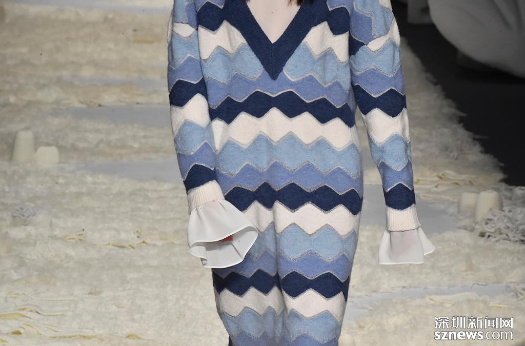 一位模特率先亮相,帽子與毛衣的搭配很有現(xiàn)代感