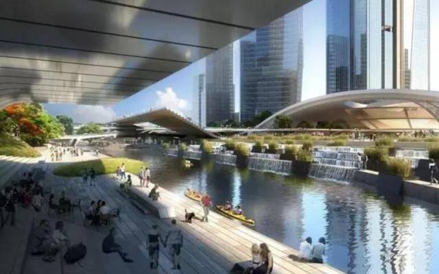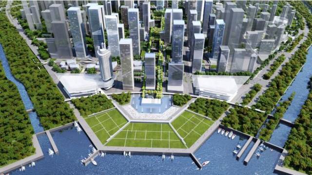 該方案中規(guī)劃了國際交流會議中心、城市演藝中心、城市博物館及雙子金融大廈等,以及地景式過街天橋、中央綠谷公園等。