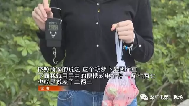 記者按照市民提供的線索,在通道上隨機(jī)選了一個(gè)攤位,購買了2斤胡蘿卜,可用自帶的便攜秤稱重后,發(fā)現(xiàn)缺了二兩。而在另外一個(gè)攤位上,記者買到的茄子也少了近3兩。