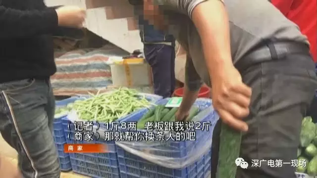 隨后,記者再次來(lái)到另外一家蔬菜攤檔,同樣選購(gòu)了兩根黃瓜,商家稱重同樣顯示的是兩斤,不過當(dāng)記者把自己的便攜秤掏出來(lái)之后,商家這回給自己變了個(gè)戲法,說要給記者換條大的。