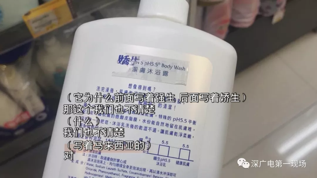 今天上午11點,記者去到中英街街口這家“卓悅”實地調(diào)查。果然看到孔女士圖片上的那款強生沐浴露。有一瓶后面貼紙被刮開,可以看到“嬌生”的字樣。這款1000毫升的強生沐浴露,售價29.9港幣,而另一種包裝,同樣1000毫升的強生沐浴露,前后名字一致,有幾種味道,價格則是每瓶35港幣-38港幣。
