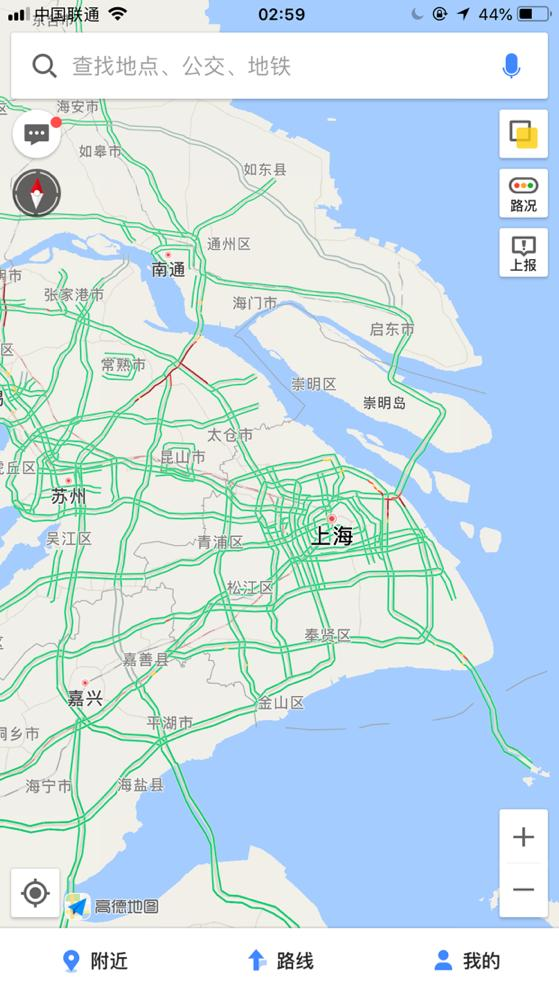 凌晨2點(diǎn)59分,上海周邊,紅色路段比較少,還算順暢的夜晚哦。