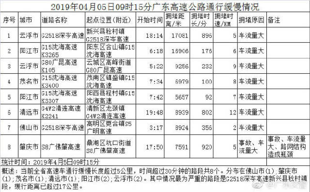 廣東交警部門(mén)此前預(yù)計(jì),從4月4日至7日全省高速公路車流都將持續(xù)處于高位,出行最高峰出現(xiàn)在4月4日15時(shí)至5日凌晨2時(shí)。4月5日9時(shí)15分,廣東高速車通行緩慢長(zhǎng)度超過(guò)5公里,時(shí)間超過(guò)30分鐘的路段共8個(gè)。