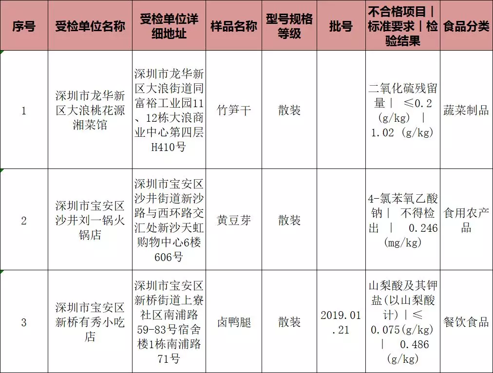 蔬菜制品不合格樣品為竹筍干,不合格受檢單位是深圳市龍華新區(qū)大浪桃花源湘菜館,不合格項目為二氧化硫殘留量。
