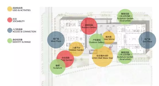 同時,設(shè)計定義了不同的功能性景觀分區(qū),一靜一動、或?qū)庫o或喧囂、光影交融、密集與開放、集聚與獨處的可變空間,為主體建筑附加了多樣化的室外活動場所,例如專門為圖書館訪客設(shè)置的讀者花園、兒童平臺、文化花園,以及在美術(shù)館區(qū)域設(shè)置的雕塑花園、戶外展覽區(qū)及鏡水面廣場。滿足不同的活動場景下市民對空間的需求,讓城市空間真正地為城市及市民所用。