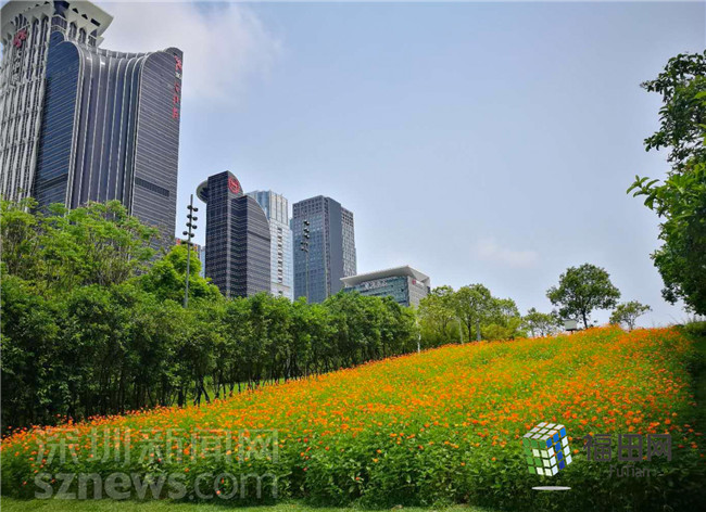 遠處的平安大廈,近處的綠樹、花海,構(gòu)成了一副靜謐美好的畫面。