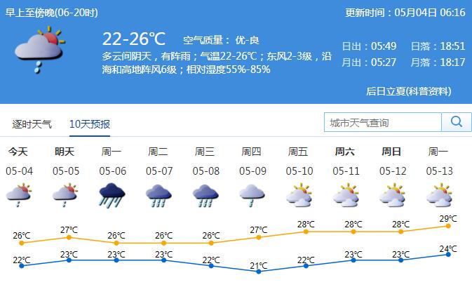 4日我市多云,可見陽光,局部有短時陣雨,氣溫21-26℃,中午前后體感微熱。