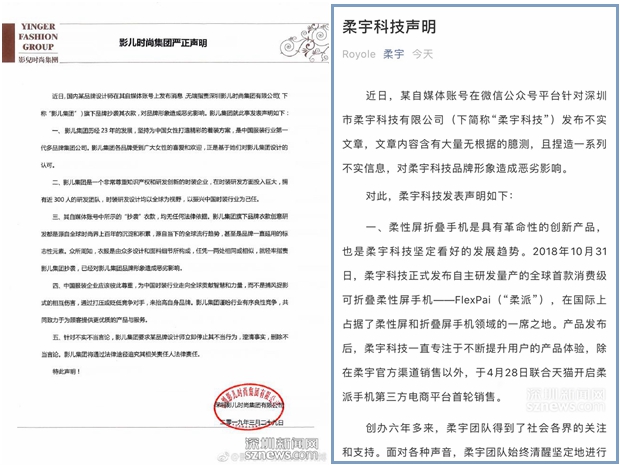 影兒時(shí)尚集團(tuán)(左)和柔宇科技(右)聲明頁面截圖