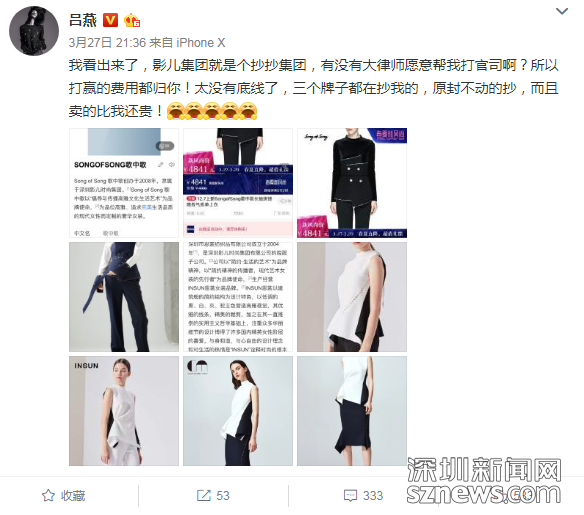 無獨(dú)有偶。5月5日,深圳影兒時(shí)尚集團(tuán)(以下簡稱:影兒集團(tuán))正式向深圳市中級人民法院提起訴訟請求,就超模呂燕多次在微博上指責(zé)影兒集團(tuán)是“抄抄集團(tuán)”,造成影兒集團(tuán)重大名譽(yù)損失和巨額經(jīng)濟(jì)損失一事,起訴超模呂燕及其公司上海是你商貿(mào)有限公司不正當(dāng)競爭,要求兩被告立即停止侵權(quán)行為,賠償經(jīng)濟(jì)損失1000萬元,并公開道歉。