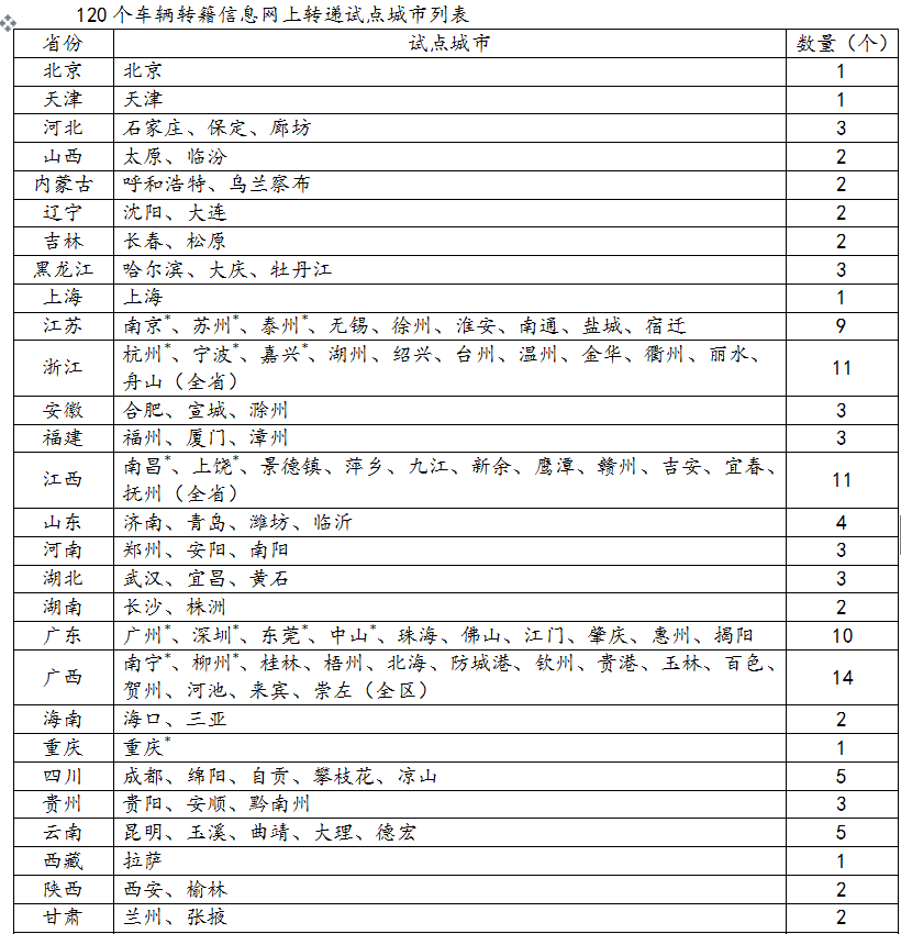 4.?dāng)U大車輛轉(zhuǎn)籍信息網(wǎng)上轉(zhuǎn)遞試點。在原有15個試點城市的基礎(chǔ)上,進(jìn)一步擴(kuò)大非營運(yùn)小微型載客汽車檔案電子化網(wǎng)上轉(zhuǎn)遞試點,在直轄市、省會市、自治區(qū)首府市、計劃單列市全部推行,同時各省(區(qū))至少再選擇1至2個城市推行。對機(jī)動車在試點城市之間轉(zhuǎn)籍的,申請人可以直接到車輛遷入地車輛管理所申請并辦理,無需再回遷出地驗車、提取紙質(zhì)檔案。