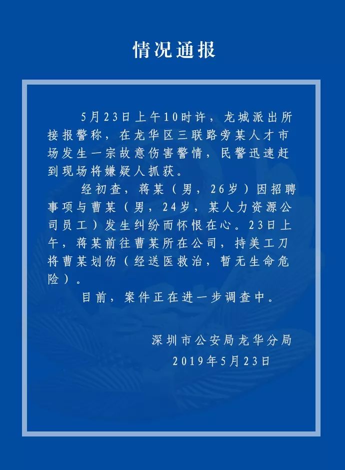 據(jù)警方通報,嫌疑人蔣某因招聘事項與某人力資源公司員工曹某發(fā)生糾紛,懷恨在心。23日上午,蔣某前往曹某所在公司,持美工刀將曹某劃傷。經(jīng)送醫(yī)救治,暫無生命危險,目前案件進一步調(diào)查當中。