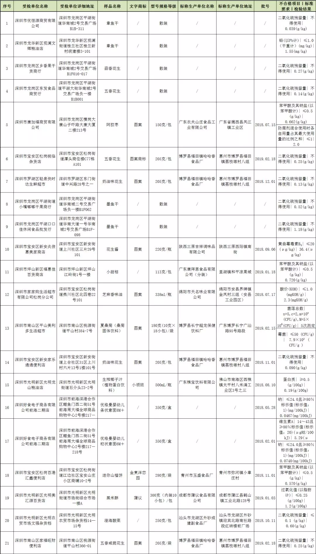 本次共抽檢流通環(huán)節(jié)食品2455批次,涉及流通環(huán)節(jié)經(jīng)營主體870家次,共檢測食品指標(biāo)14705項次。其中檢出不合格樣品21批次,涉及不合格食品類別有炒貨食品及堅果制品6批次,食用油、油脂及其制品1批次,蔬菜制品1批次,薯類和膨化食品1批次,水產(chǎn)制品4批次,水果制品3批次,特殊膳食食品2批次,調(diào)味品1批次,飲料2批次;涉及不合格項目類別為金屬等元素污染、微生物污染、食品添加劑、品質(zhì)指標(biāo)、生物毒素污染。