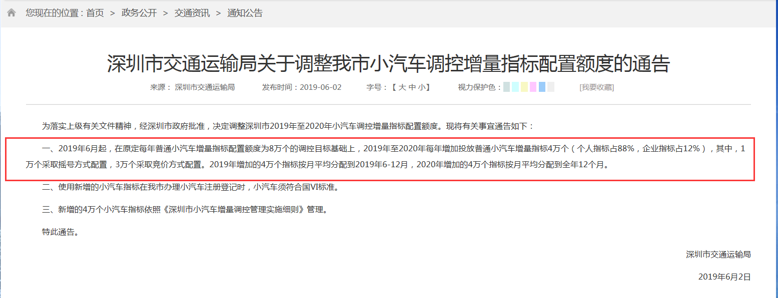 6月2日,深圳市交通運(yùn)輸局發(fā)布了關(guān)于調(diào)整我市小汽車調(diào)控增量指標(biāo)配置額度的通告