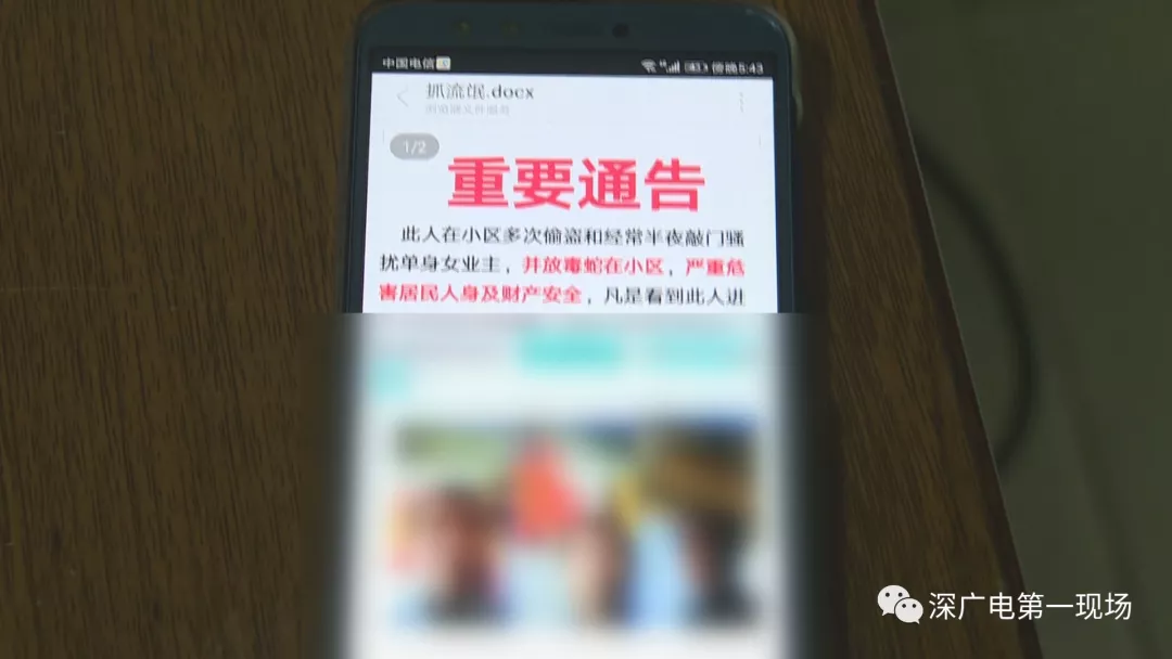 ▲小區(qū)通報全體業(yè)主的告示,提醒住戶要堤防鬧事男子。
