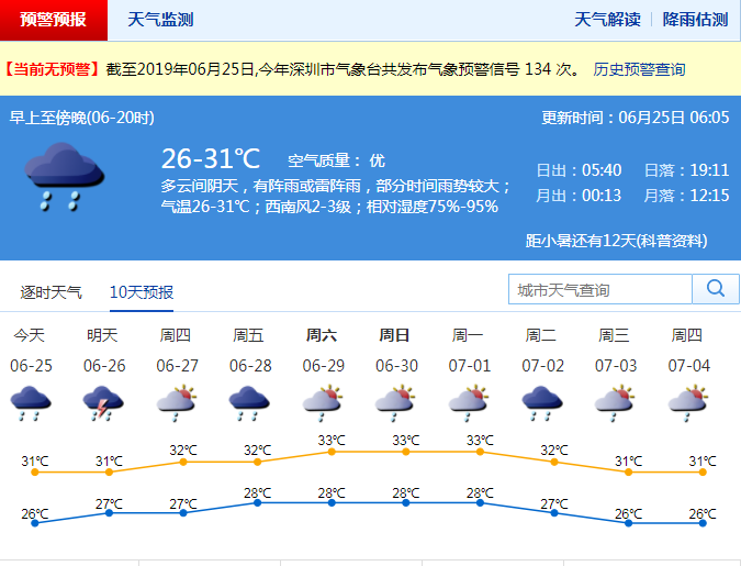 深圳新聞網(wǎng)2019年6月25日訊 昨日,深圳啟動暴雨IV級應(yīng)急響應(yīng),全市普遍出現(xiàn)大雨,局部暴雨,最高氣溫26℃左右,高溫天氣緩解。市氣象臺預(yù)測,未來兩天風(fēng)力清勁,多陣雨,局部大雨。