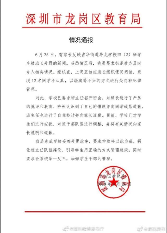 原標(biāo)題:30多名小學(xué)生排隊(duì)被班長“拳打腳踢”?龍崗區(qū)教育局通報來了