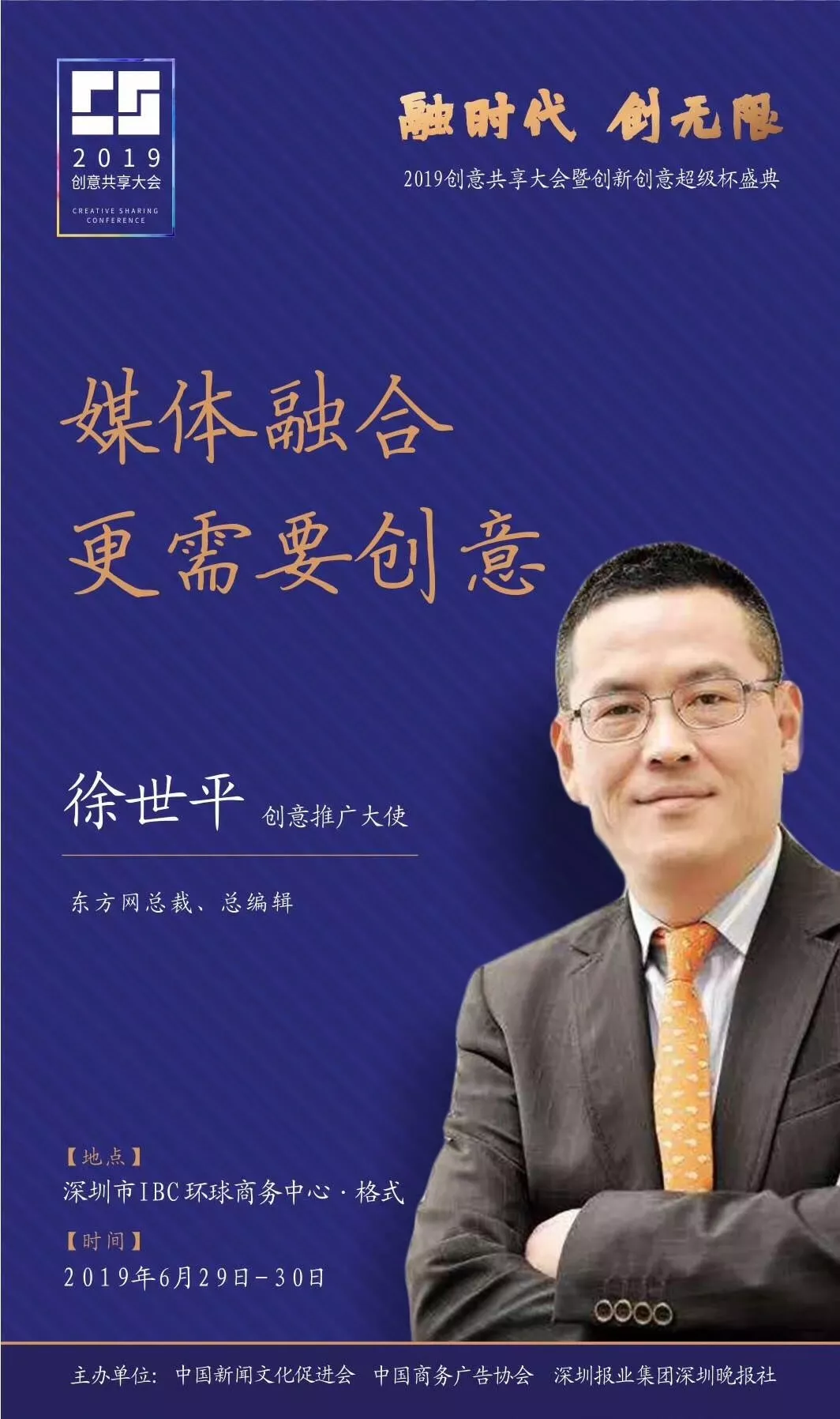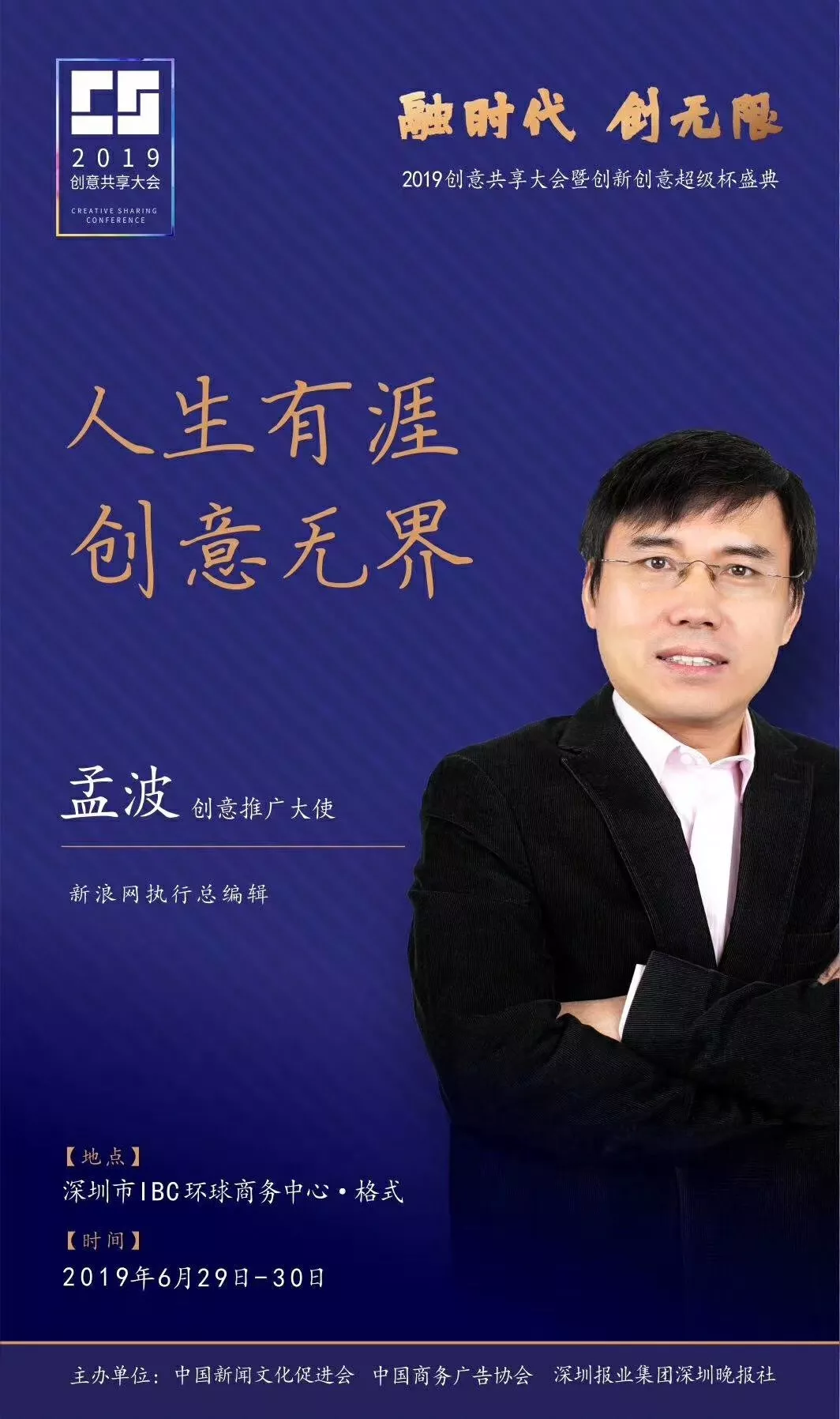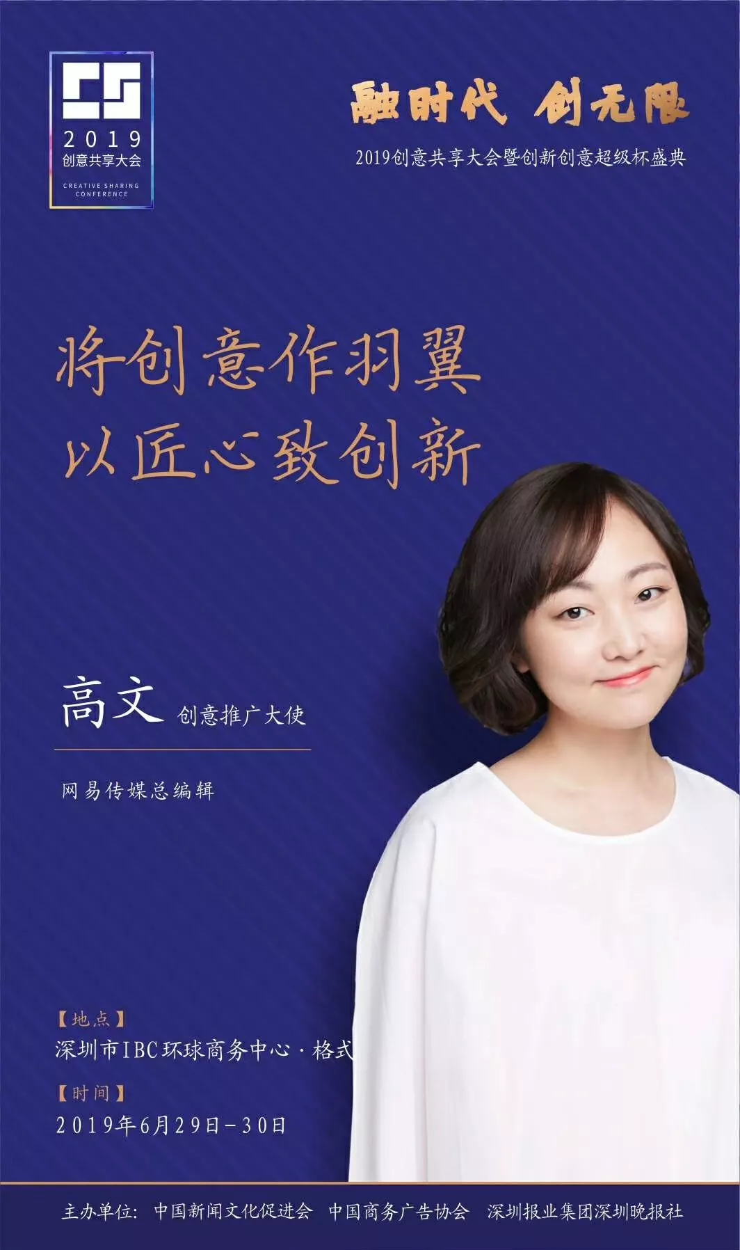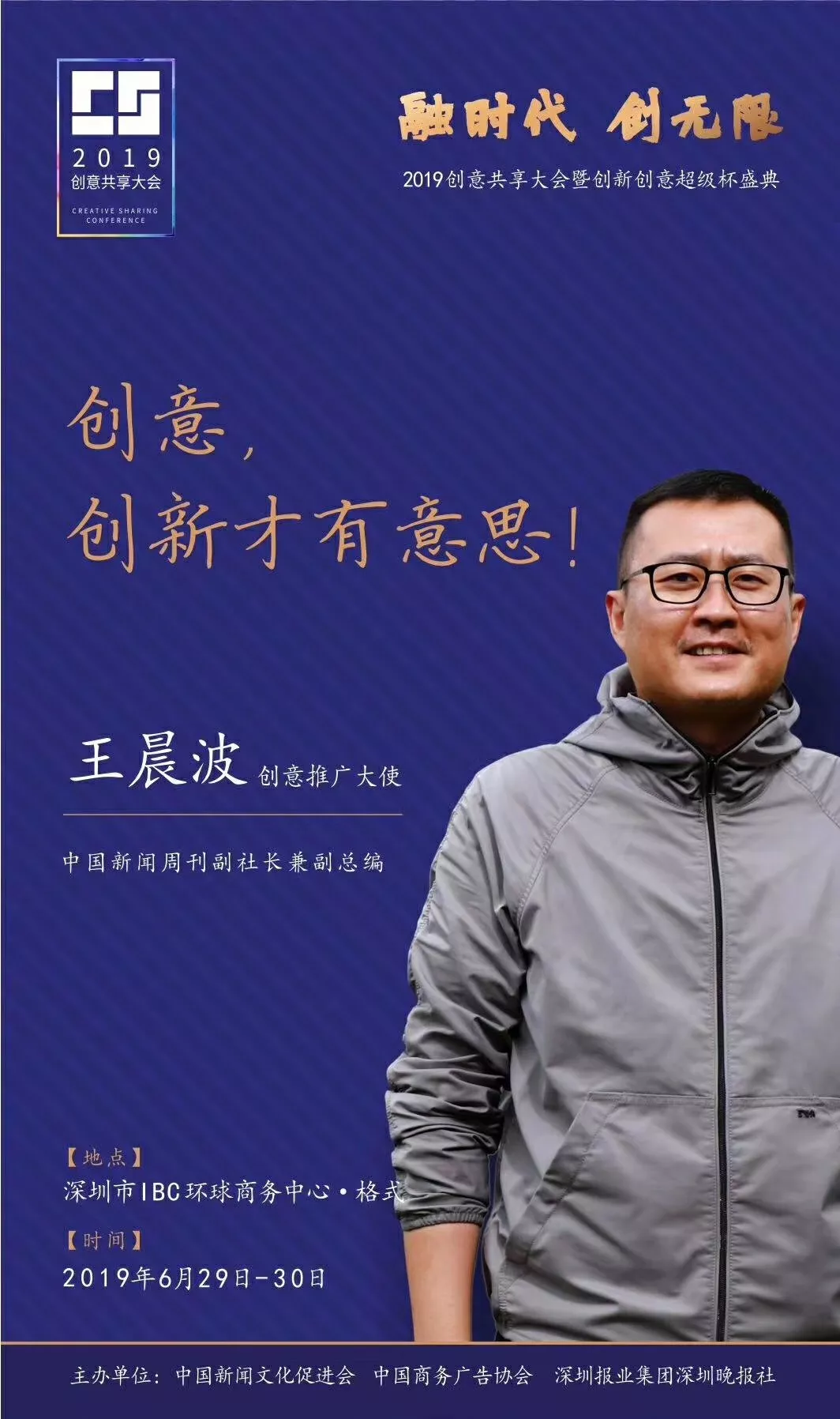 為了展現(xiàn)創(chuàng)意中國的精神風(fēng)貌和創(chuàng)意傳媒的文化力量,構(gòu)建創(chuàng)新創(chuàng)意共同體,擘畫美好圖景和未來趨勢,2019年6月29日至30日,由中國新聞文化促進(jìn)會(huì)、中國商務(wù)廣告協(xié)會(huì)、深圳報(bào)業(yè)集團(tuán)深圳晚報(bào)社等聯(lián)合主辦的“融時(shí)代創(chuàng)無限——2019創(chuàng)意共享大會(huì)暨創(chuàng)新創(chuàng)意超級杯盛典”將在深圳市IBC環(huán)球商務(wù)中心隆重舉辦。