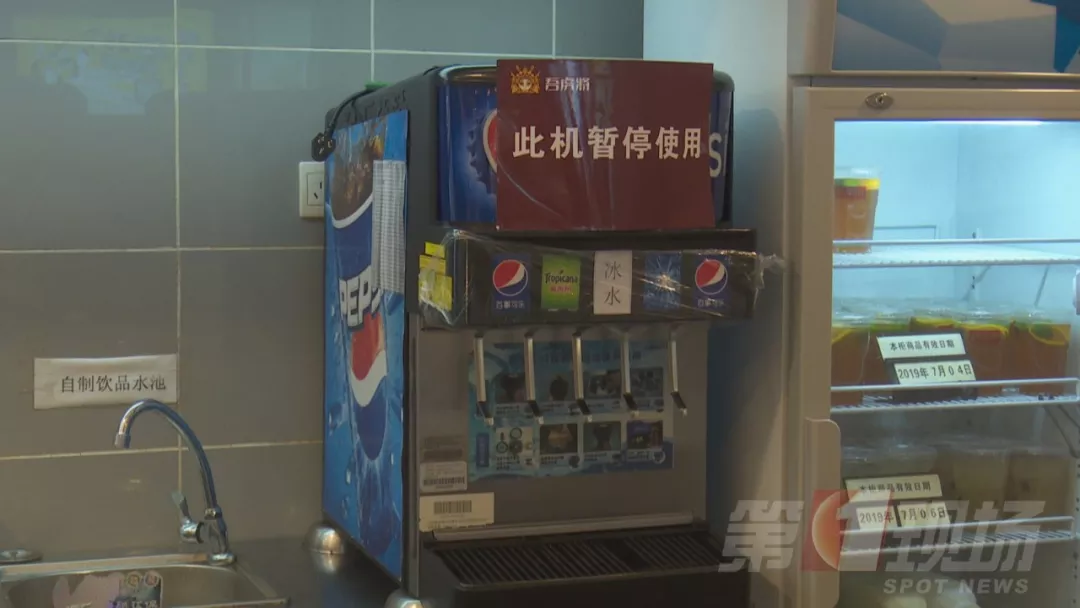 今天中午,記者跟隨轄區(qū)市監(jiān)所執(zhí)法人員來到涉事門店現場檢查。據了解,2號事發(fā)后,店里的這臺飲料機已經暫停使用,目前飲料出口是用保鮮膜封住的。店方稱,飲料機,每個月由百事可樂廠家人員深層清洗一次,他們的員工是每天對飲料機的糖漿管道和濾嘴進行清洗,都有清洗記錄。