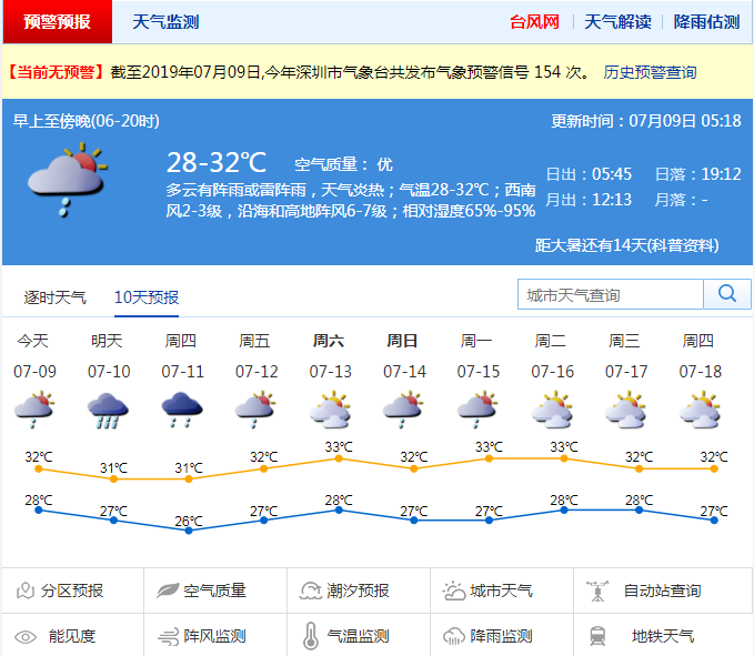 深圳新聞網(wǎng)2019年7月9日訊 近幾天,深圳天氣炎熱,有短時(shí)陣雨,白天最高氣溫達(dá)到31~33 ℃。預(yù)計(jì)9日有陣雨或雷陣雨,10~11日將有一次中到大雨局部暴雨過程,伴有雷暴和7~8級(jí)短時(shí)大風(fēng),炎熱天氣將有所緩解。