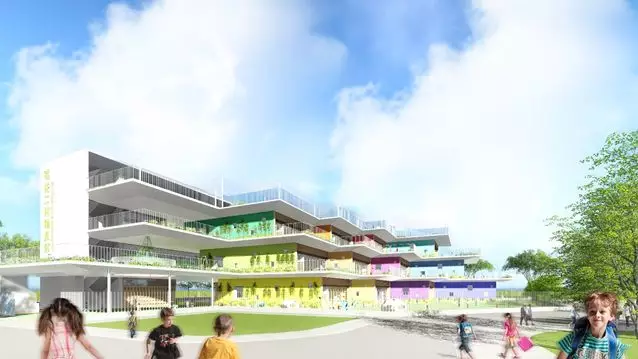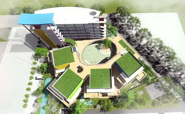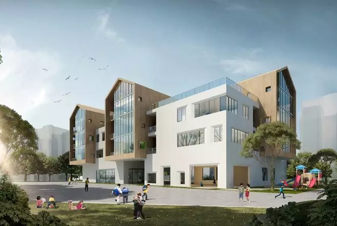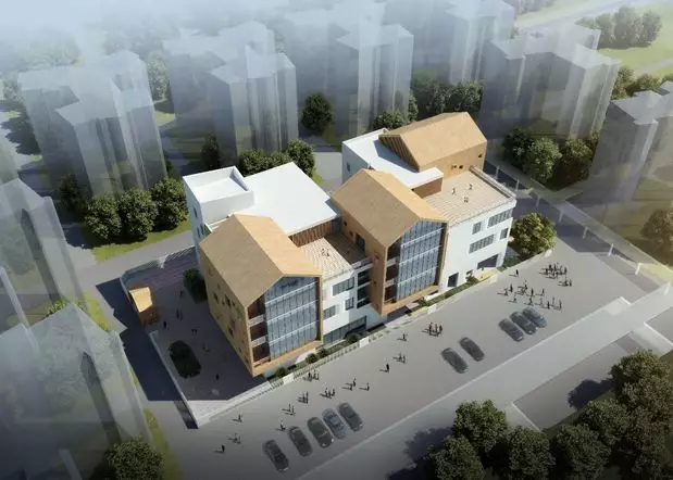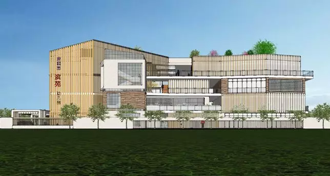 建筑造型簡潔現(xiàn)代,在白色體量上嵌入三個木色坡屋頂體塊,如積木城堡一般,富有童趣,建筑設(shè)有集中活動平臺作為補充。