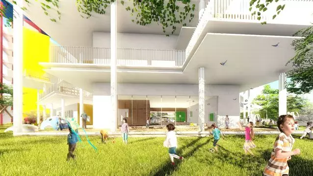室外環(huán)境設(shè)有滿足孩子們的橡膠跑道、人工草坪,大型娛樂滑梯設(shè)施等等,各層也設(shè)置了公共平臺,為幼兒提供多樣化的樂趣,滿足幼兒好奇、好動、好模仿的特點。在屋頂設(shè)置了綠植與小型趣味玩具區(qū),讓幼兒接觸自然,喜歡自然。